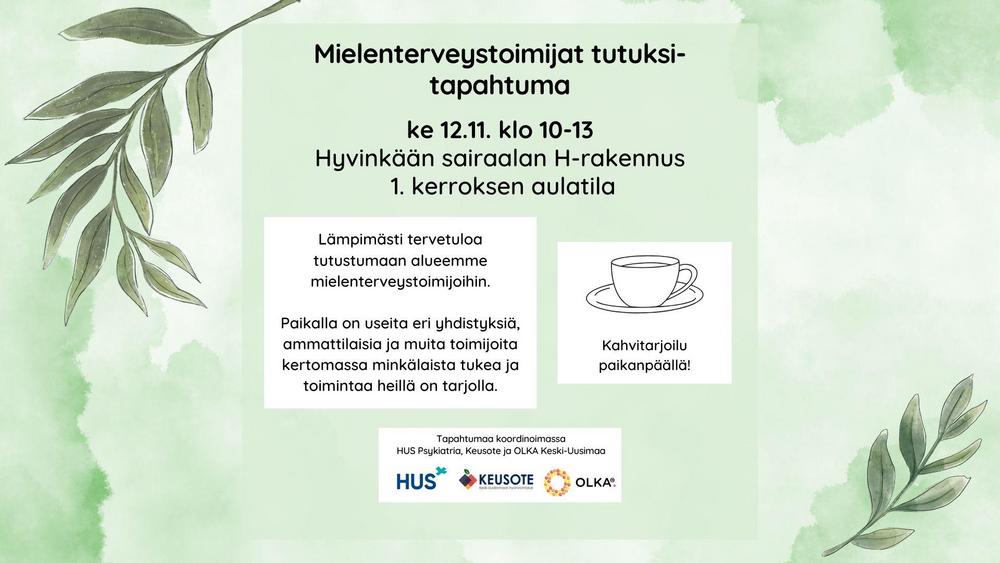 Hyvinkään sairaalan H-rakennuksen 1. kerroksen aulassa Lämpimästi tervetuloa tutustumaan alueemme mielenterveystoimijoihin. Paikalla on useita eri yhdistyksiä, ammattilaisia ja muita toimijoita…
