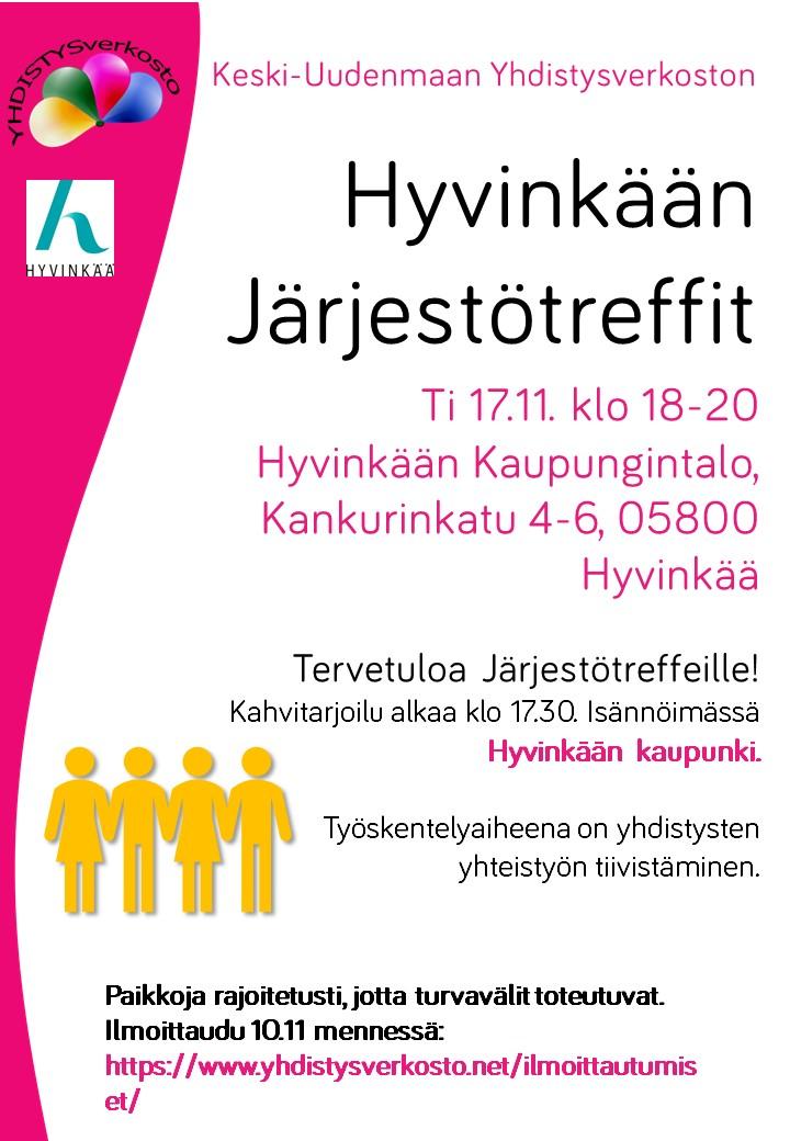 Tervetuloa Hyvinkään Järjestötreffeille tapaamaan muita järjestötoimijoita! Treffit järjestetään tiistaina 17.11. klo 18-20 Hyvinkään Kaupungintalolla. Illan aiheena on yhdistysten yhteistyön tiivistäminen.