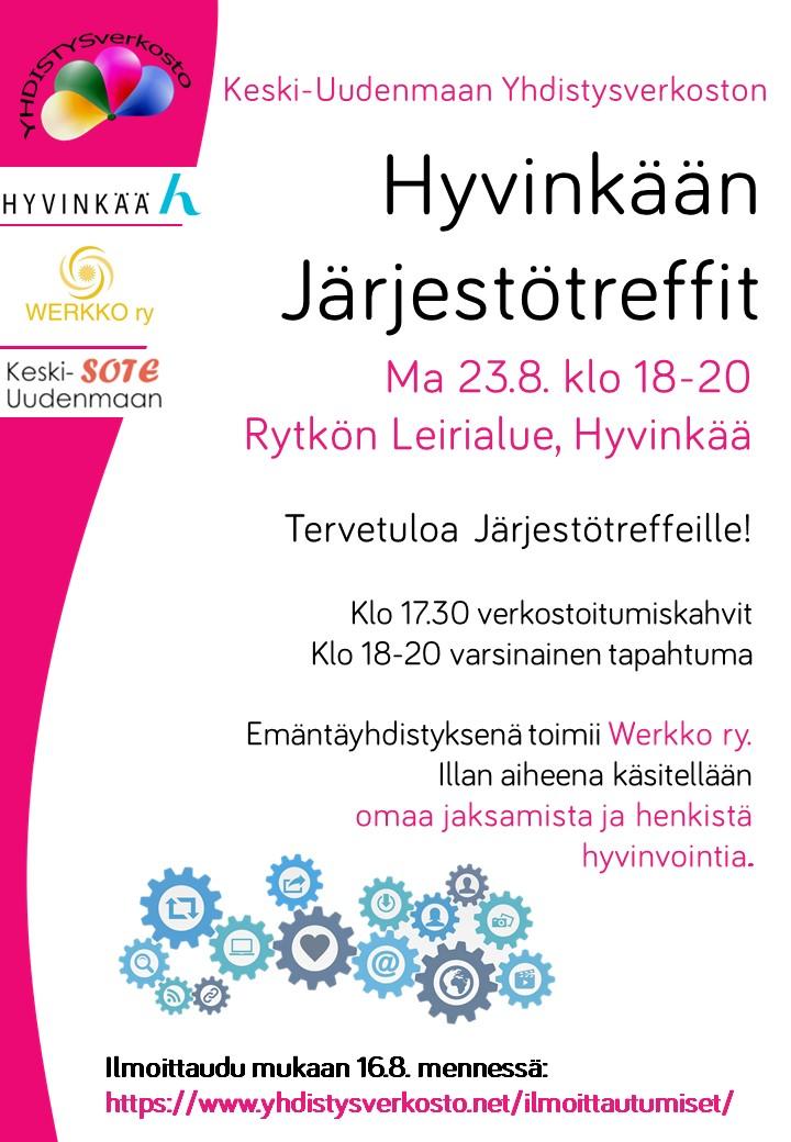 Hyvinkään Järjestötreffit järjestetään maanantaina 23.8. Järjestötreffit alkavat vapaamuotoisilla verkostoitumiskahveilla klo 17.30. Varsinainen tapahtuma on klo 18-20 ja illan aiheena käsitellään omaa jaksamista ja henkistä hyvinvointia. Isäntäyhdistyksenä toimii Werkko ry.