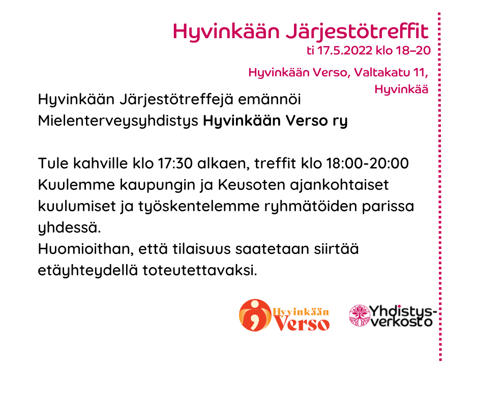 Hyvinkään Järjestötreffejä emännöi Mielenterveysyhdistys Hyvinkään Verso ry