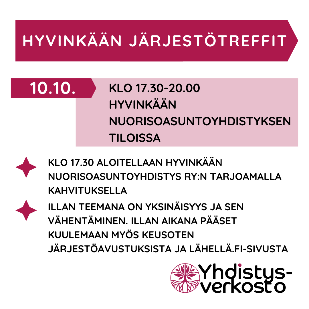 Lämpimästi tervetuloa Hyvinkään Järjestötreffeille 10.10. klo 17.30-20.00! Treffit aloitetaan klo 17.30 kahvittelulla!
