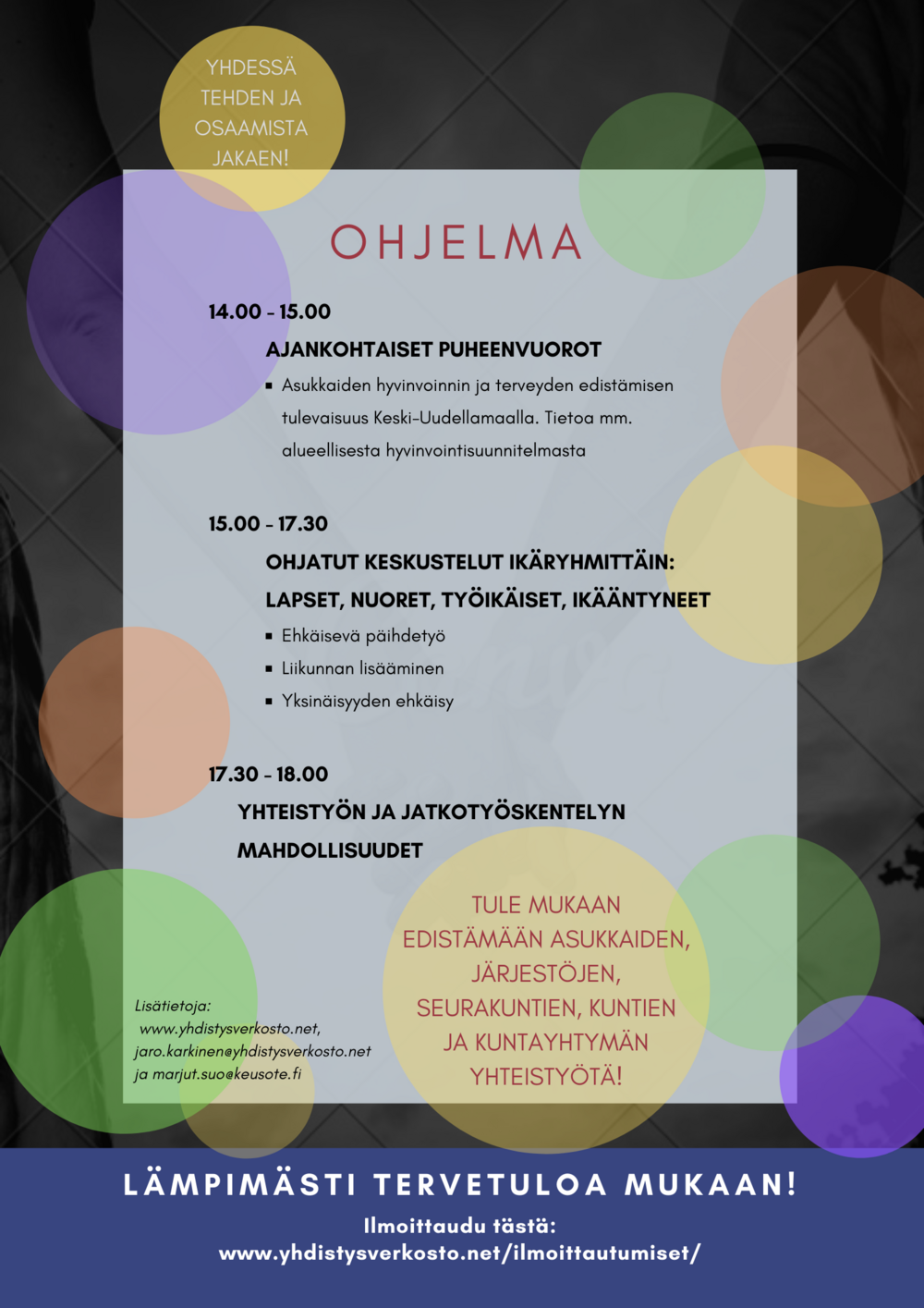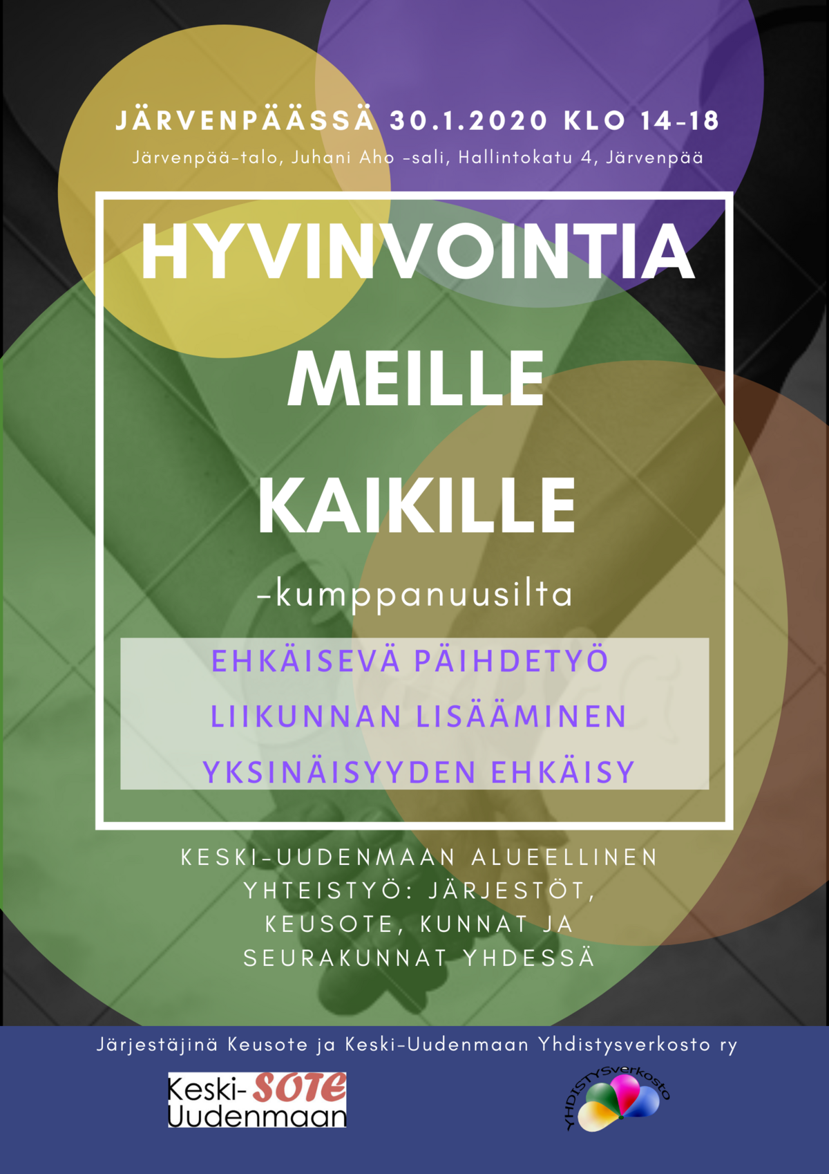 Tervetuloa Keski-Uudenmaan Yhdistysverkoston ja Keusoten järjestämään suureen kumppanuustapahtumaan. Teemoina ehkäisevä päihdetyö, liikunnan lisäminen ja yksinäisyyden ehkäisy.