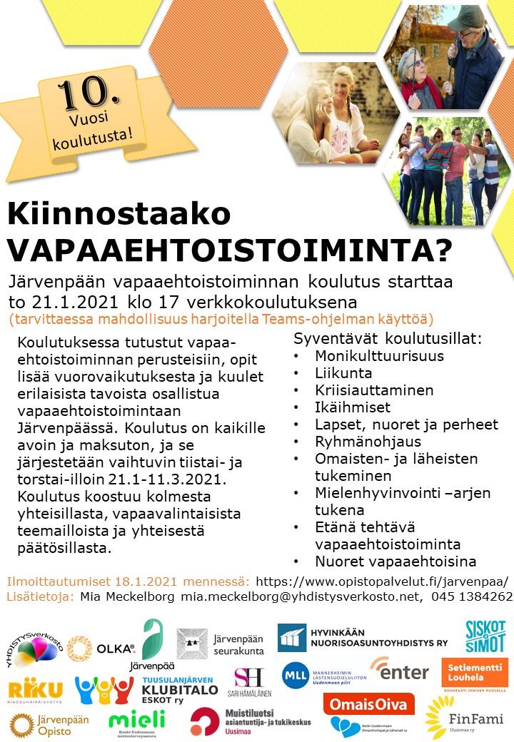 Koulutus sopii kaikille, jotka haluavat saada vapaaehtoistoiminnasta uutta sisältöä elämäänsä. Suoritetusta koulutuskokonaisuudesta saa todistuksen. Koulutuksessa annetaan tietoa vapaaehtoistoiminnan perusasioista; toiminnan merkityksestä, yleisistä periaatteista sekä vuorovaikutustaidoista. Tutustumme erityyppisiin vapaaehtoistehtäviin Järvenpäässä mm. ikäihmisten, lapsiperheiden, maahanmuuttajien parissa tai mielen hyvinvointiin liittyvissä tehtävissä.