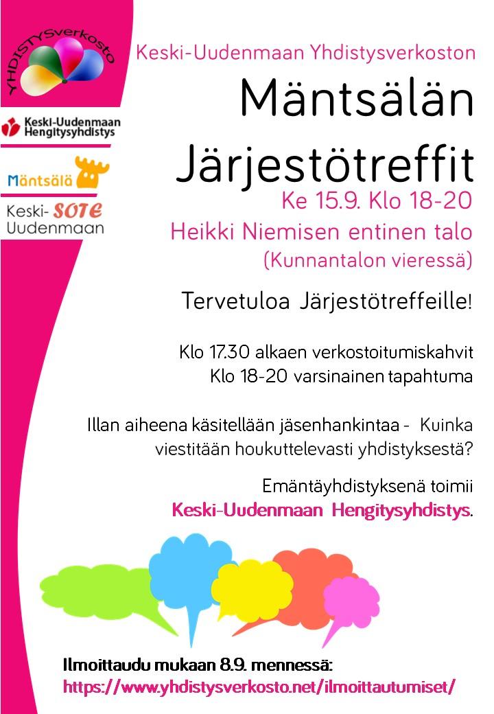 Mäntsälän Järjestötreffit järjestetään keskiviikkona 15.9. Järjestötreffit alkavat vapaamuotoisilla verkostoitumiskahveilla klo 17.30. Varsinainen tapahtuma on klo 18-20 ja illan aiheena käsitellään jäsenhankintaa - kuinka viestitään houkuttelevasti yhdistyksestä? Emäntäyhdistyksenä toimii Keski-Uudenmaan Hengitysyhdistys.