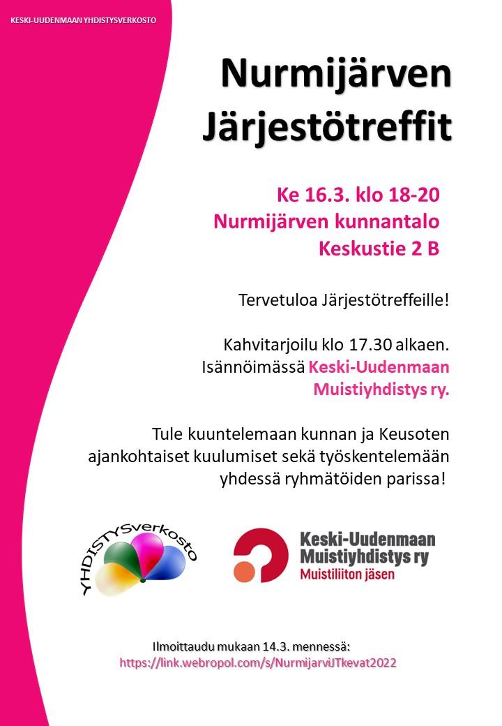 Isäntänä Keski-Uudenmaan Muistiyhdistys ry. Kuulemme kunnan ja Keusoten ajankohtaiset kuulumiset ja työskentelemme yhdessä ryhmätöissä.