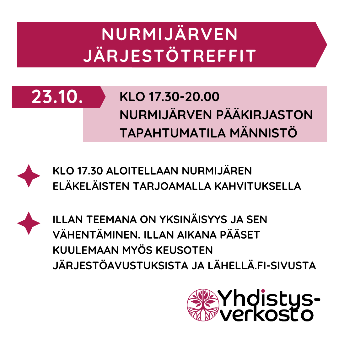 Lämpimästi tervetuloa Nurmijärven Järjestötreffeille 23.10. klo 17.30-20.00! Treffit aloitetaan klo 17.30 kahvittelulla!