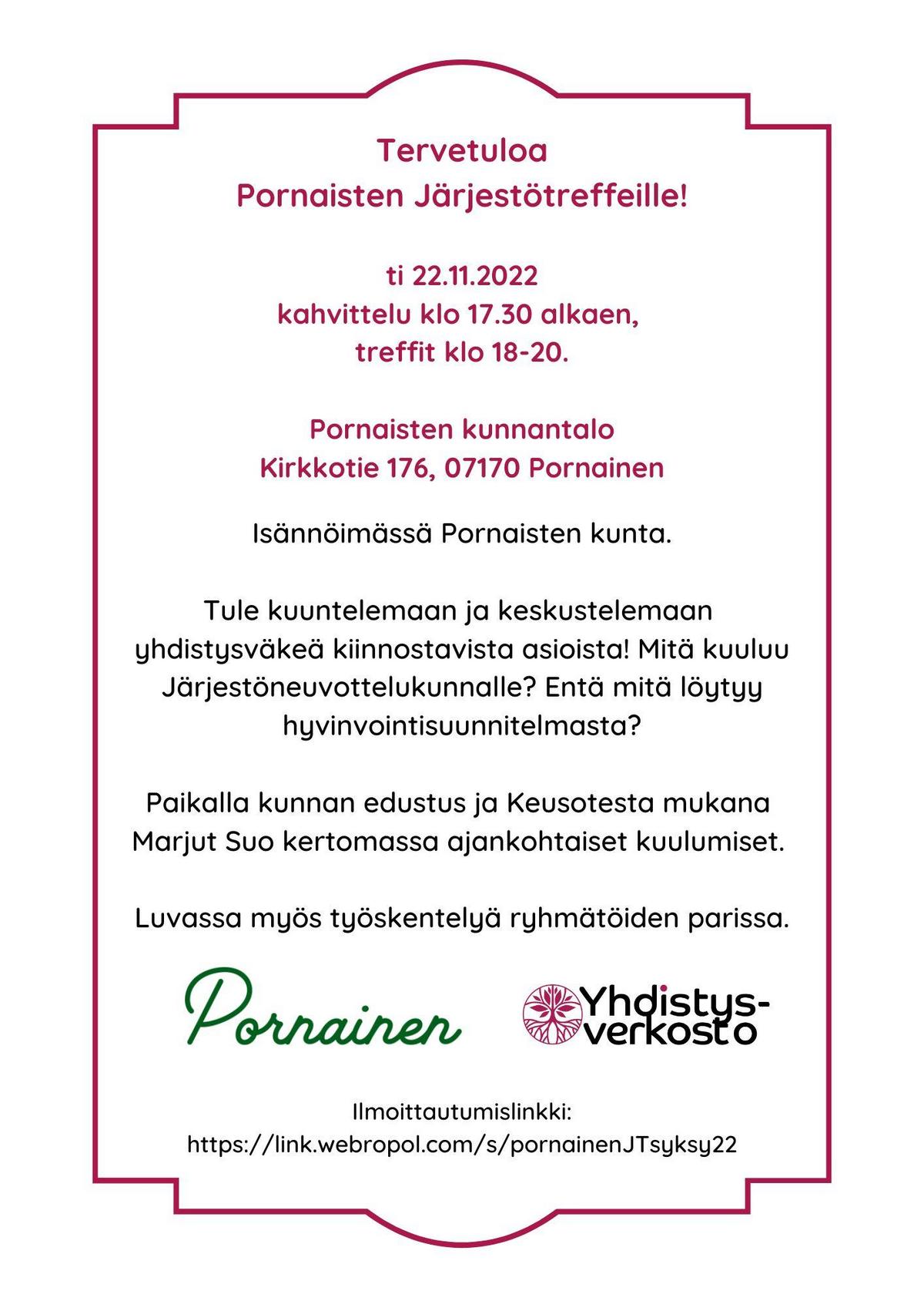 Ilmoittaudu mukaan tästä linkistä:https://link.webropol.com/s/pornainenJTsyksy22