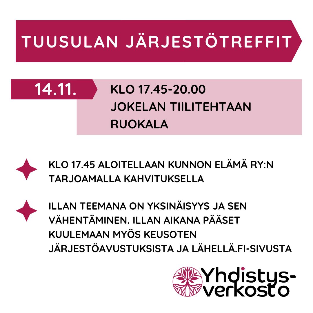 Lämpimästi tervetuloa Tuusulan Järjestötreffeille 14.11. klo 17.45-20.00! Treffit aloitetaan klo 17.45 kahvittelulla!