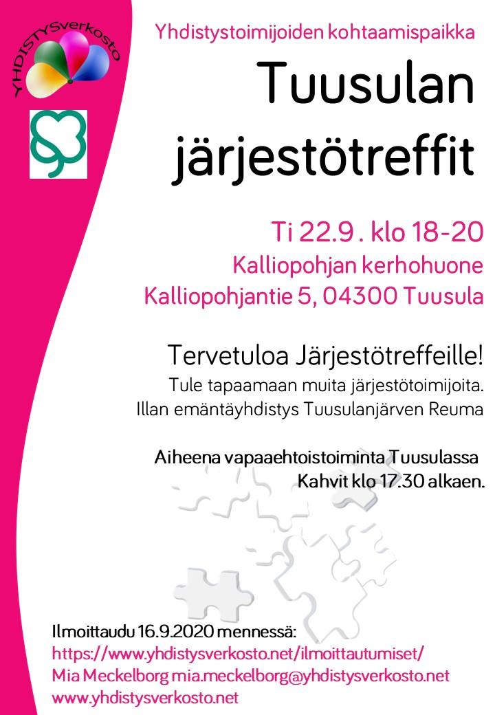 Tule tapaamaan muita järjestötoimijoita. Illan emäntäyhdistys Tuusulanjärven Reuma. Aiheena vapaaehtoistoiminta Tuusulassa. Kahvit klo 17.30 alkaen.