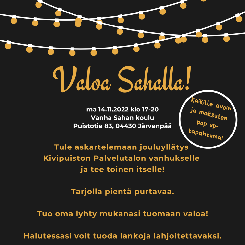 Tervetuloa kaikille avoimeen ja maksuttomaan pop up tapahtumaan Vanhalle Sahan koululle!